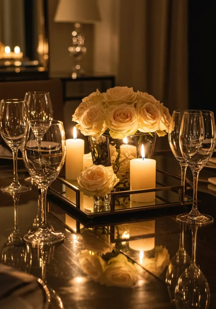 This design feels like a cozy evening wrapped in candlelight. Soft cream roses fill the centerpiece, surrounded by flickering candles that reflect beautifully on a dark polished table. The mirrored tray adds a touch of glamour while keeping the arrangement simple and refined.