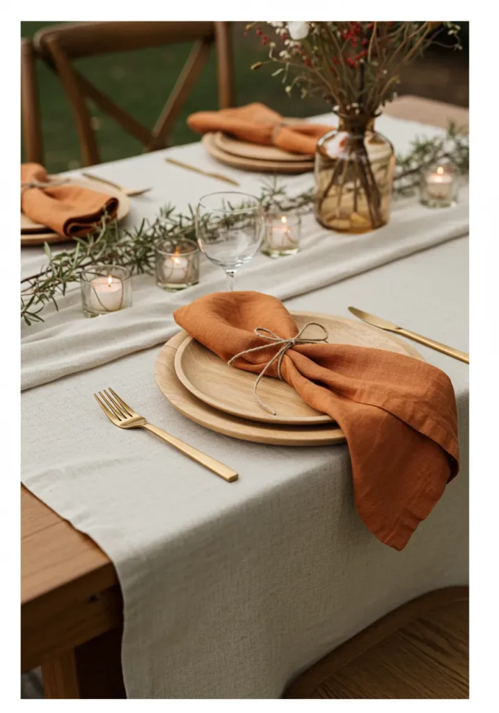 This simple setup embraces natural textures and muted tones. Wooden plates, soft linen napkins in burnt orange, and sprigs of rosemary create an earthy and relaxed mood. Small votive candles and a linen runner keep the look effortless yet polished.