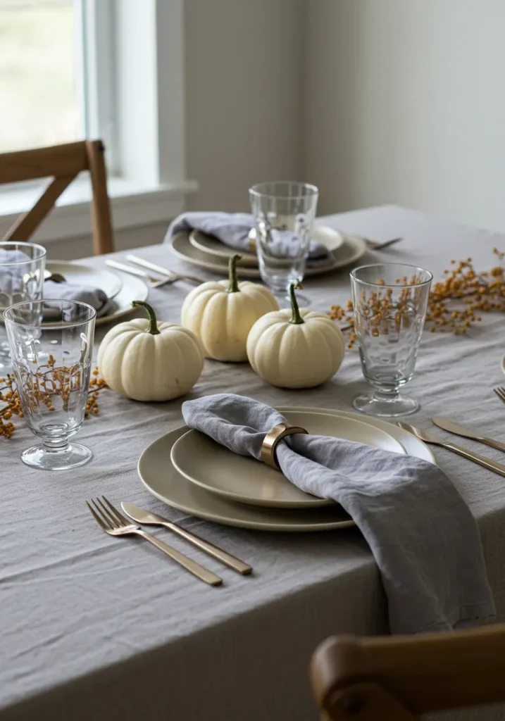 This design blends modern simplicity with classic seasonal charm. A soft grey tablecloth, neutral dinnerware, and delicate white pumpkins create a calm and elegant look. The muted palette lets the textures and shapes shine, making the setup feel airy and intentional.