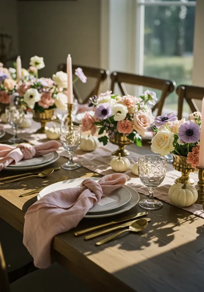 This tablescape mixes soft pink tones with golden accents, giving the room a romantic glow. Pale blush napkins tied loosely over neutral plates bring a casual charm, while gold flatware adds warmth. The pastel flower arrangements blend creamy whites, blush roses, and lavender blooms, making everything feel balanced and inviting. Tiny white pumpkins tucked between the vases bring a subtle Thanksgiving touch without taking over the scene.