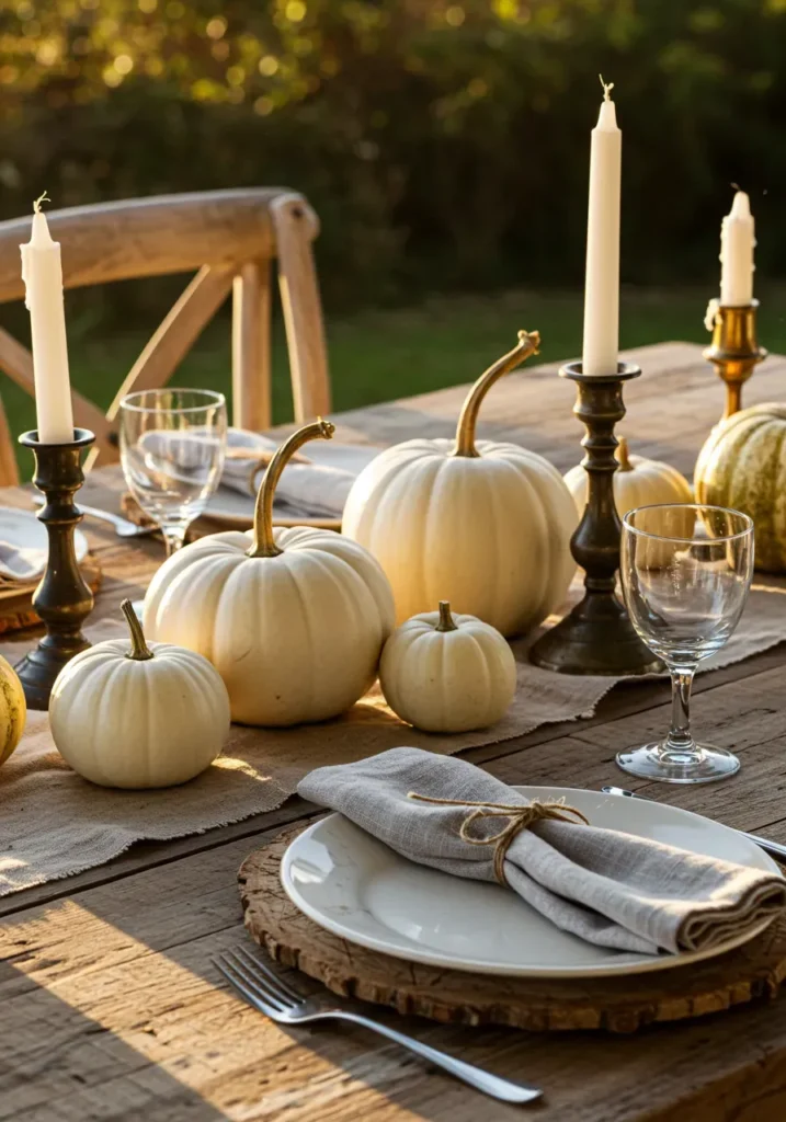 This cozy tablescape celebrates autumn with soft golden light and creamy white pumpkins spread across a rustic wooden table. Brass candlesticks and linen napkins tied with twine add old-fashioned warmth, giving the setup a simple but inviting charm. The neutral palette keeps it timeless, while the pumpkins tie everything back to the Thanksgiving season in the sweetest way.