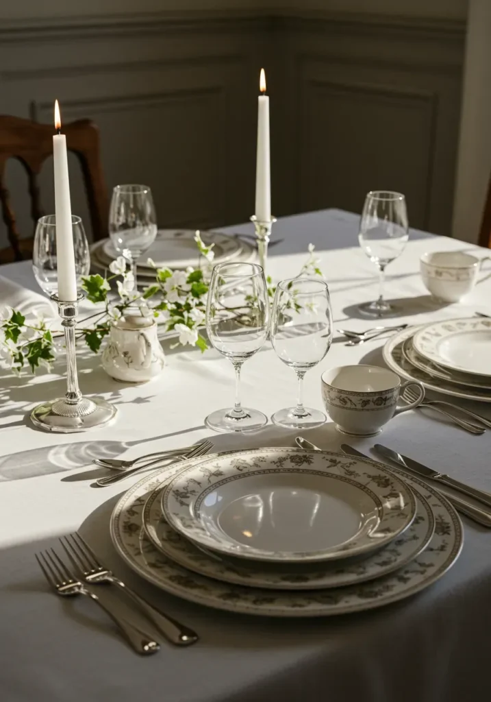 This setting captures timeless beauty with its crisp white tablecloth, silver cutlery, and fine china detailed with delicate floral patterns. Slender candles flicker softly beside glassware that catches the afternoon light, giving everything a graceful air. The simplicity of white-on-white is made lively by the subtle greenery that trails through the center, adding freshness and movement.
