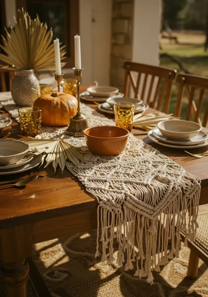 This tablescape brings a cozy, relaxed vibe with earthy tones and natural textures. The macramé runner adds handmade character, while brass candlesticks and amber glasses reflect the golden sunlight. A pumpkin centerpiece anchors the design, surrounded by pottery bowls and dried palms that give it a grounded, autumn feel.