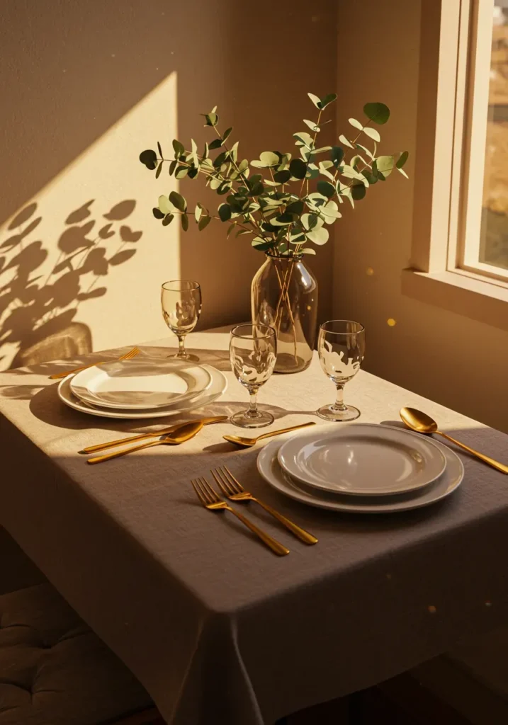 What I love most is how the light transforms this scene. The golden reflections make the whole space glow naturally, turning minimalism into something cozy. It’s proof that simplicity, when done right, feels just as special as a fully dressed table.