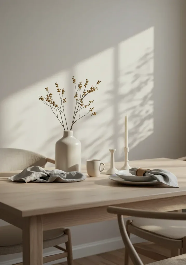 This Scandinavian-inspired tablescape focuses on light wood tones and soft neutrals. A few carefully chosen details—a ceramic vase with slender branches, linen napkins, and clean white candles—create balance and calm. Natural sunlight streaming across the pale surface enhances the soothing palette.