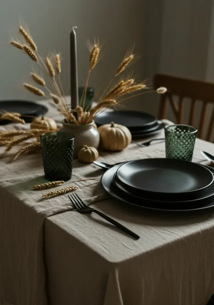 This table design combines modern simplicity with earthy elegance. Matte black plates, wheat stalks in a small ceramic vase, and soft beige linens come together in a striking contrast. The muted colors and natural textures give off a calm, grounded atmosphere—perfect for anyone who prefers understated sophistication over traditional holiday sparkle.
