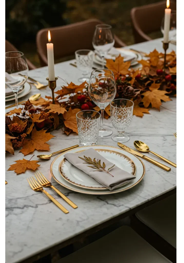 Here’s a tablescape that feels luxurious without being over the top. Golden cutlery, crystal glasses, and a marble tabletop set the stage for rich fall leaves and a few red berries. Everything comes together beautifully, glowing softly under candlelight. The look is polished yet still full of Thanksgiving warmth.