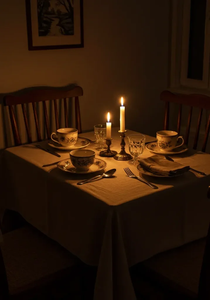 This intimate setup captures the magic of a small, candlelit Thanksgiving dinner. The table is set with classic floral china and soft linens, while warm candlelight fills the space with a nostalgic glow. It feels like a quiet moment frozen in time, filled with comfort and connection.