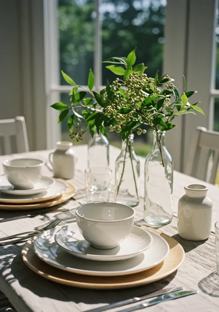 Here’s a clean and modern take with soft sunlight streaming over a neutral linen tablecloth. Gold flatware pairs with clear etched glassware and simple white plates, while a glass vase with fresh greenery adds a hint of organic beauty. The layout feels intentional yet relaxed, with every element working quietly together.