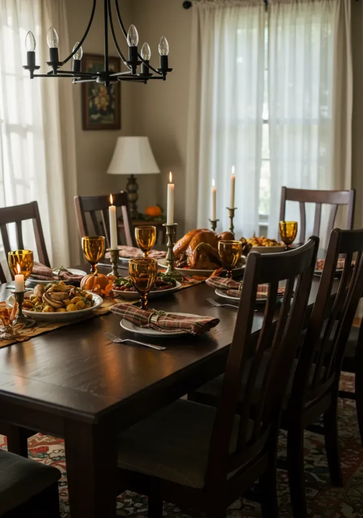This traditional dining setup feels instantly familiar and comforting. A polished dark wood table holds a golden roasted turkey surrounded by classic dishes, plaid napkins, and amber glass goblets. The brass candlesticks cast a warm glow across the table, while soft daylight filters through the curtains, creating a cozy yet refined Thanksgiving scene.