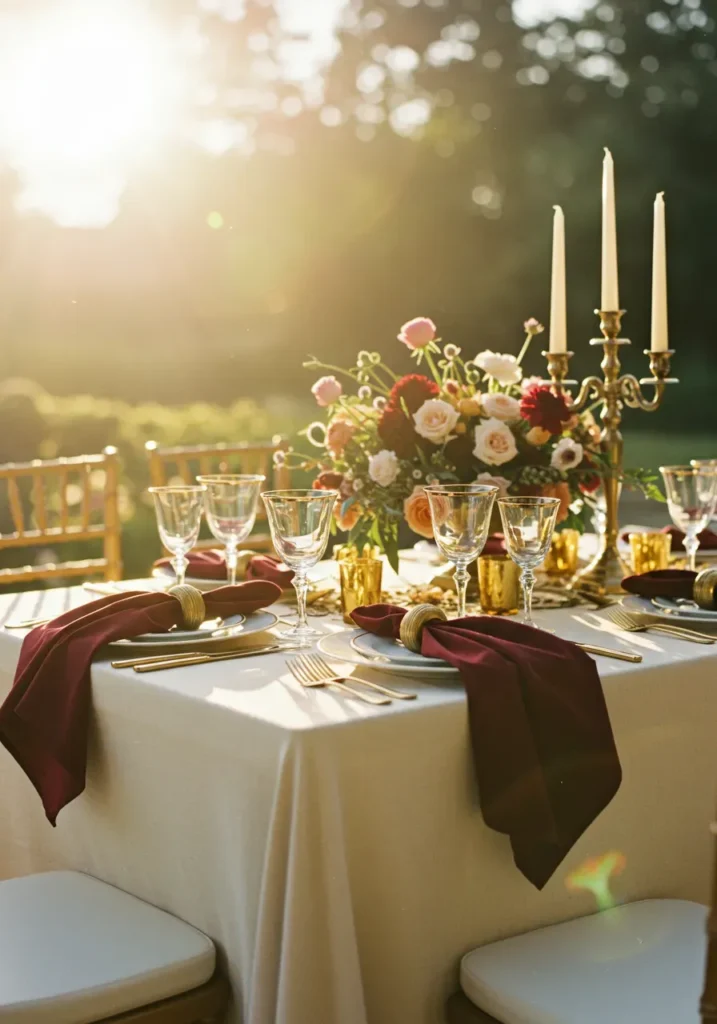This outdoor tablescape glows beautifully in the late afternoon sun. The table is covered with a crisp linen cloth and decorated with gold accents, deep burgundy napkins, and lush floral arrangements in soft pink and red. Gold candelabras add a romantic touch, and the sunlight streaming through the glassware gives the whole setting a dreamy, golden shimmer.