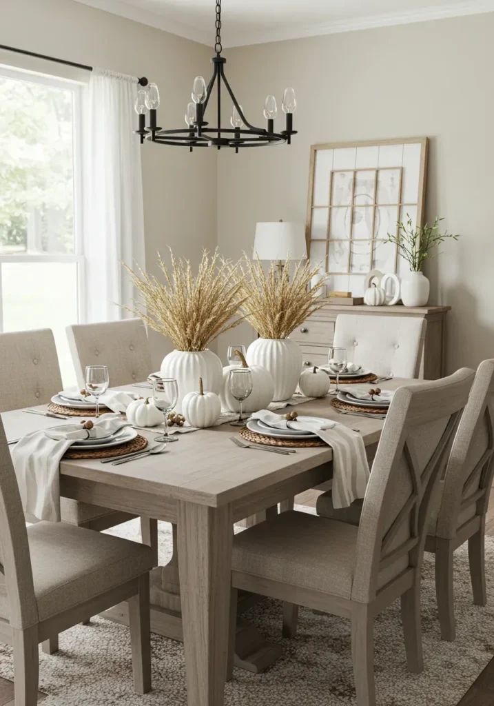 This dining room captures a modern farmhouse look with its soothing neutral tones and natural textures. A light wood table is paired with soft beige chairs and layered with white pumpkins, woven placemats, and matching vases filled with wheat stalks. The overall effect is bright, clean, and perfectly balanced—simple yet undeniably stylish.