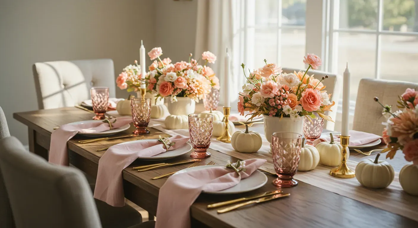 I find this setup absolutely charming. The gentle blush tones and greenery make it feel like a Thanksgiving celebration with a hint of spring freshness. It’s graceful, feminine, and ideal for anyone who loves a little romance in their table decor.