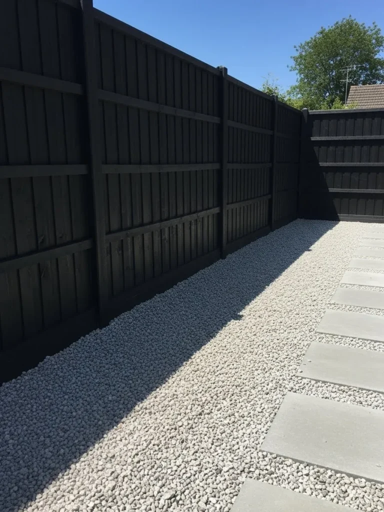 This space uses a tall black wooden privacy fence with tight vertical boards that fully block outside views. The dark finish creates a strong boundary while still feeling tidy and intentional. Light gravel along the fence line brightens the space and keeps things low maintenance. Simple stepping stones add structure without clutter.