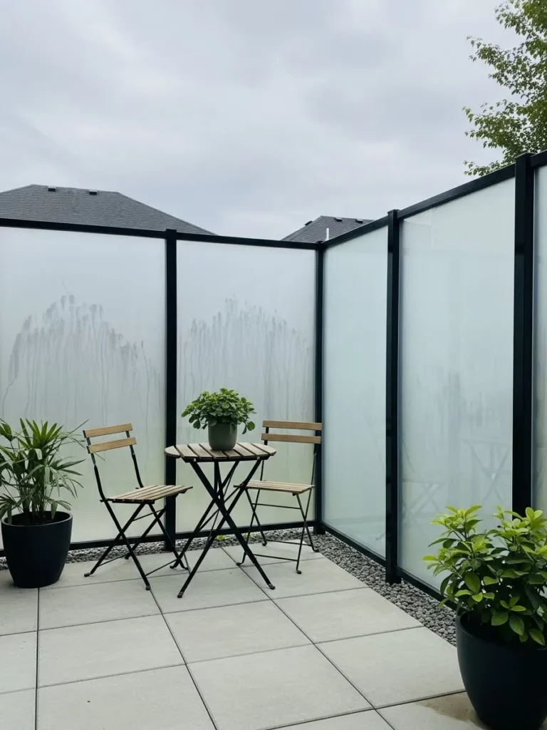 This design features frosted glass privacy panels framed in sleek black metal. The panels let light pass through while keeping everything behind them blurred and hidden. Pale pavers and minimal furniture keep the look clean and airy. Potted plants soften the edges and add warmth.