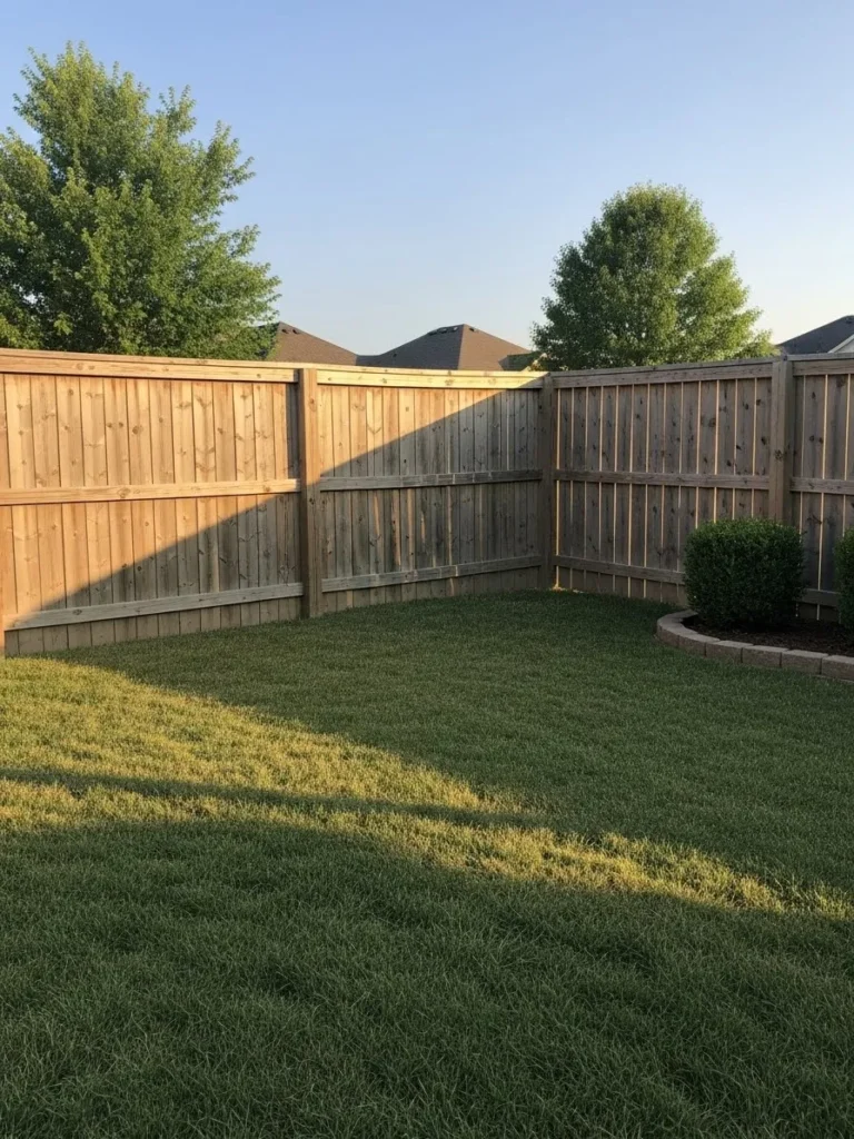 This backyard uses a classic wooden privacy fence with a natural finish and simple framing. The fence wraps the yard neatly while leaving plenty of open grass space. A small landscaped corner adds balance without taking over. Everything feels familiar and comfortable.