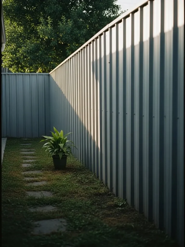 This space features a tall corrugated metal fence that creates a solid and modern boundary. The vertical lines add height and make the yard feel more enclosed. A narrow stepping stone path and a single plant keep the space from feeling harsh. The muted metal color blends nicely with greenery.