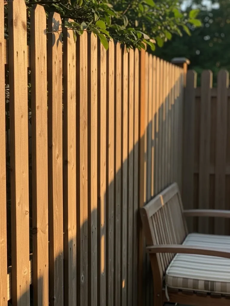 This design uses slim vertical wooden slats that create privacy while keeping a warm and inviting look. The natural wood catches the sunlight beautifully. A simple bench tucked against the fence turns the space into a quiet retreat. Greenery peeks over the top for a softer feel.