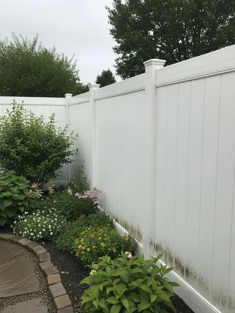 This space uses a tall white privacy fence with classic vertical panels and decorative posts. A curved garden bed filled with flowering plants softens the clean lines of the fence. The bright white finish makes the greenery stand out beautifully. Everything feels neat and well cared for.