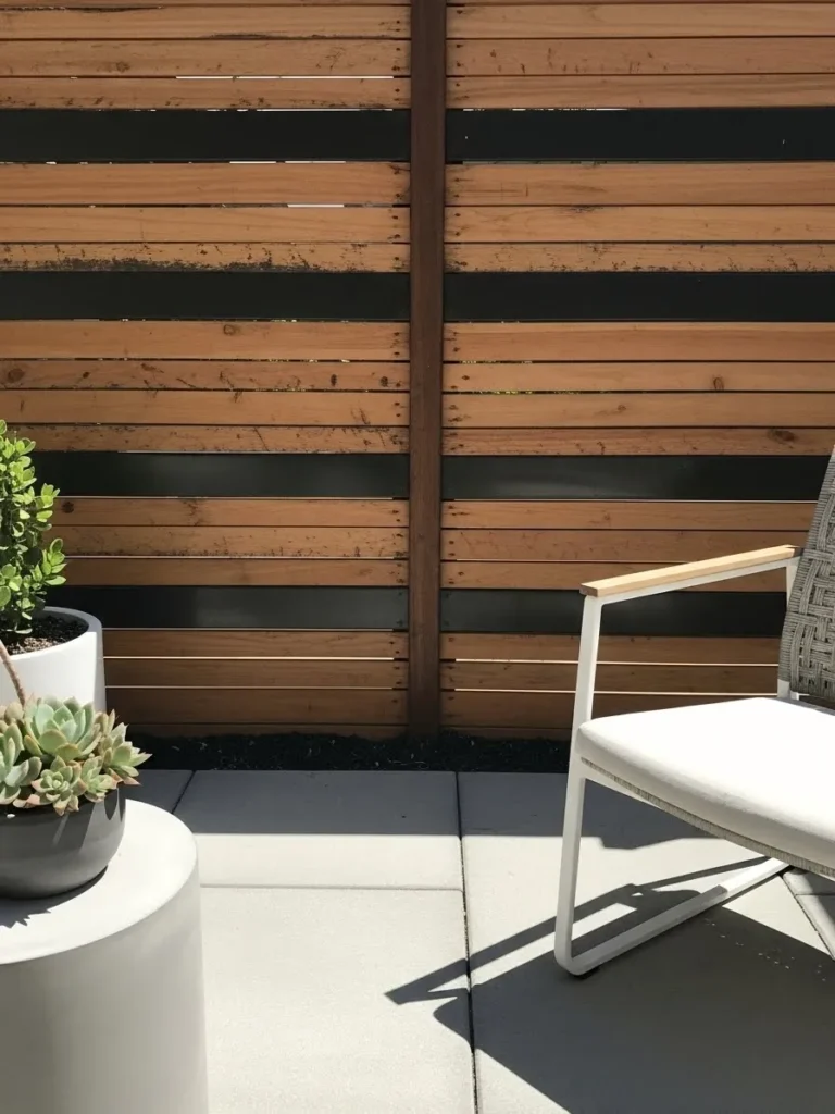 This fence uses horizontal wood slats paired with dark metal accents for a modern look. The spacing between boards offers privacy while still feeling airy. Neutral patio furniture and minimal planters keep the space polished. Everything feels balanced and intentional.