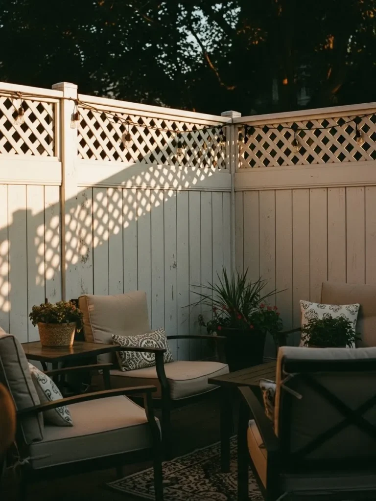 This white privacy fence combines solid panels with a decorative lattice top that lets in just enough light. The warm outdoor seating and soft cushions create a comfortable patio nook tucked away from view. String lights and potted plants add charm while keeping the space enclosed and intimate. Everything feels thoughtfully arranged for slow evenings outside.
