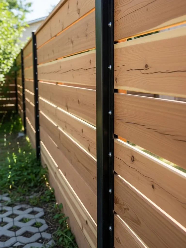 This fence features wide horizontal wood slats mounted on dark metal posts for a clean modern look. The wood grain is visible and warm while the spacing keeps the fence visually interesting. It offers privacy without feeling bulky. The design works beautifully alongside greenery and simple paving.