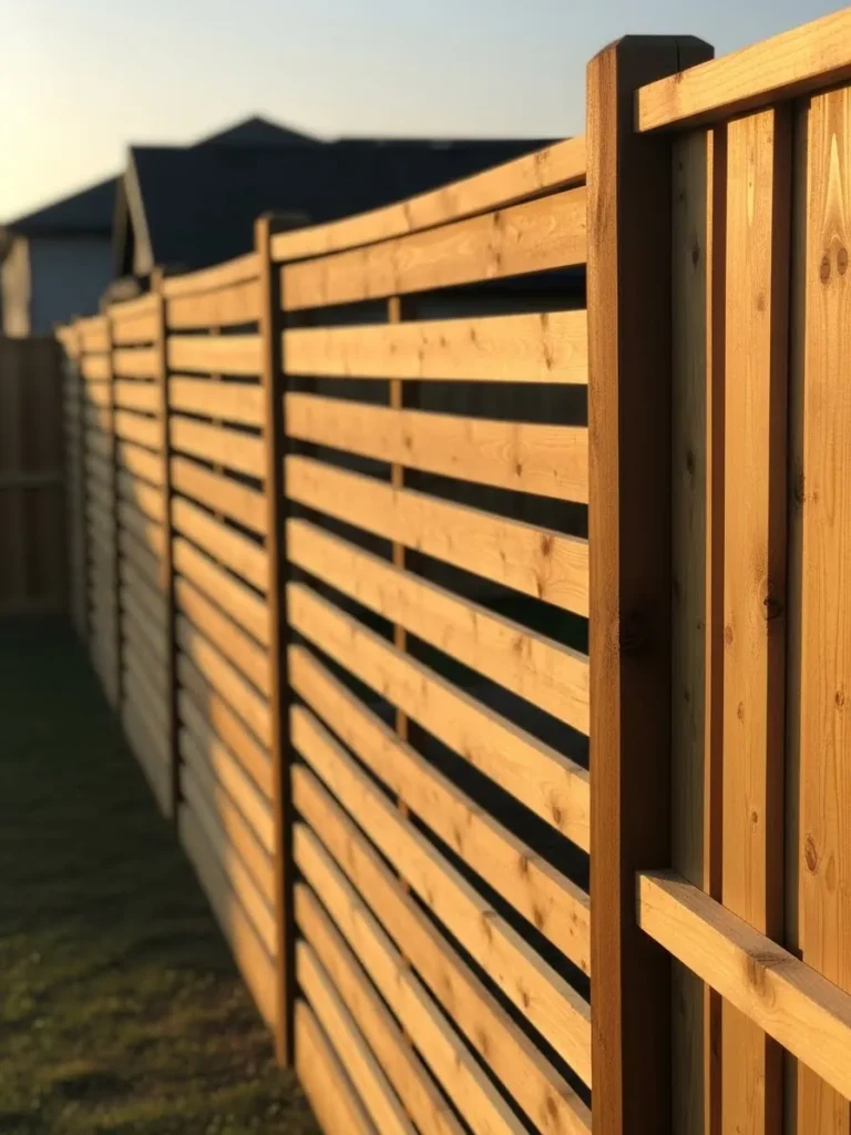 This design features a modern horizontal slat fence made from smooth natural wood. The boards are evenly spaced to block views while still letting light pass through. The warm sunlight highlights the wood grain and gives the fence a soft glow. It feels sleek but still approachable.