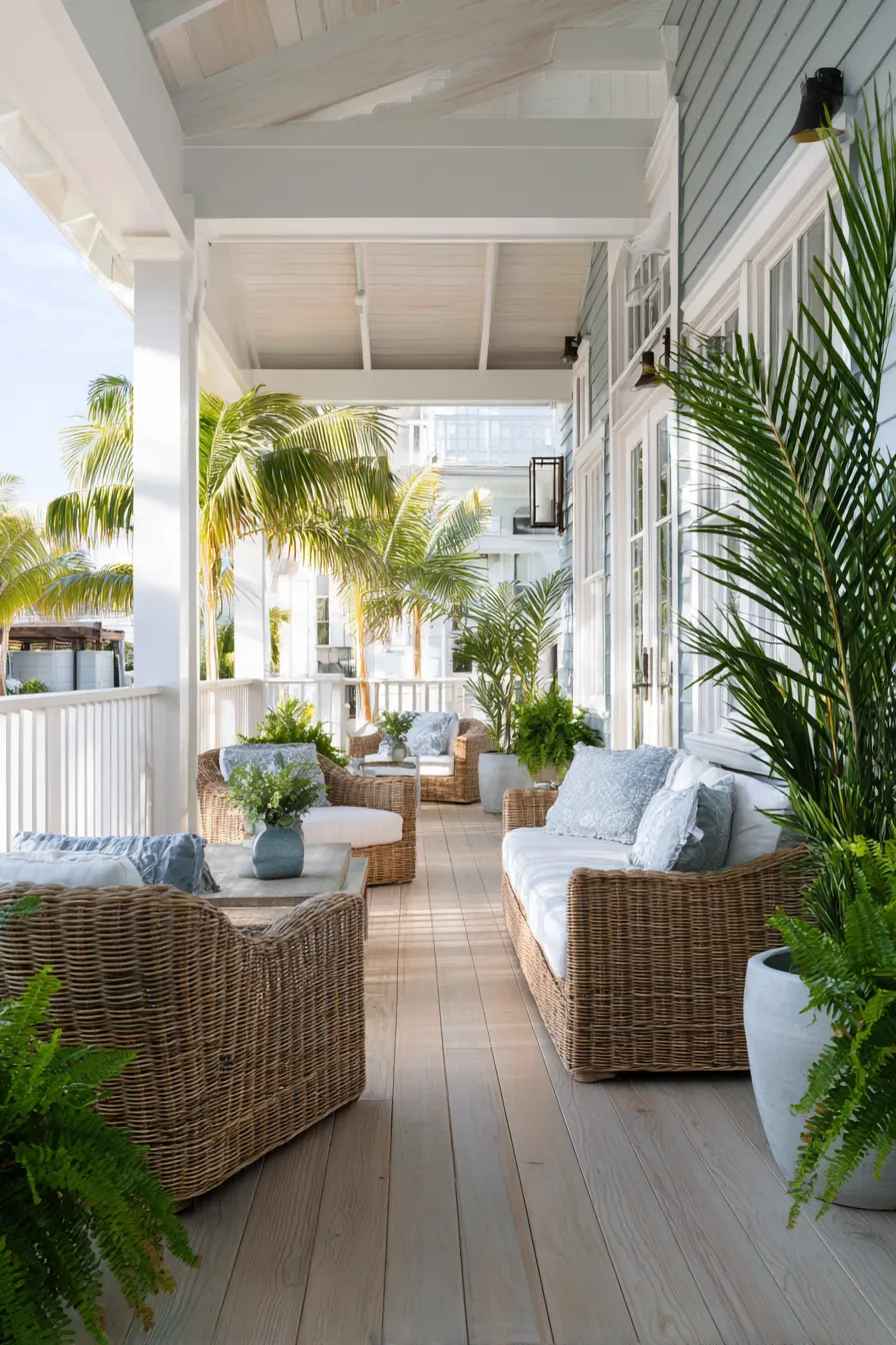 This porch leans into a coastal vibe with wicker seating, soft cushions, and tall potted palms placed just right. The greenery creates a natural screen that blocks views while keeping the space open and breezy. Light wood floors and pale colors keep everything feeling fresh. The porch feels relaxed and welcoming.