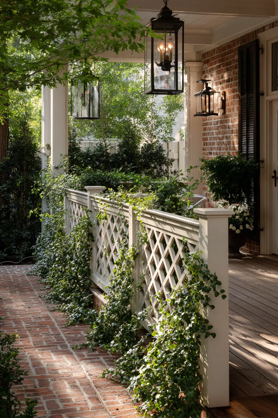 This porch pairs brick flooring with white trellis panels covered in climbing greenery. Hanging lanterns and leafy plants create a cozy buffer from the outside. The trellis adds charm while still allowing light to filter through. Everything feels balanced and timeless.