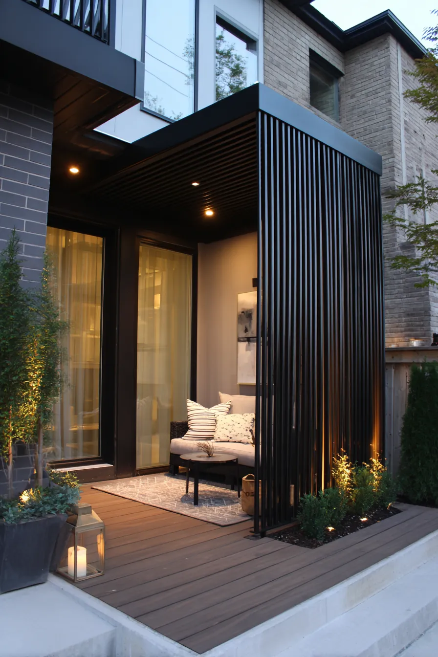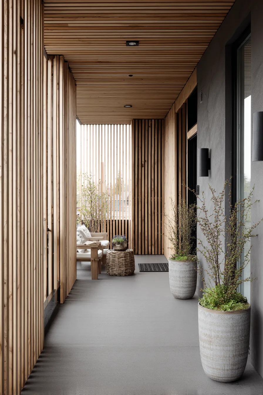 This porch relies on slim wood slats to blur the view from outside while still letting light in. Neutral planters and a small seating area make the space feel calm and uncluttered. The layout feels simple and intentional. Everything works together quietly.