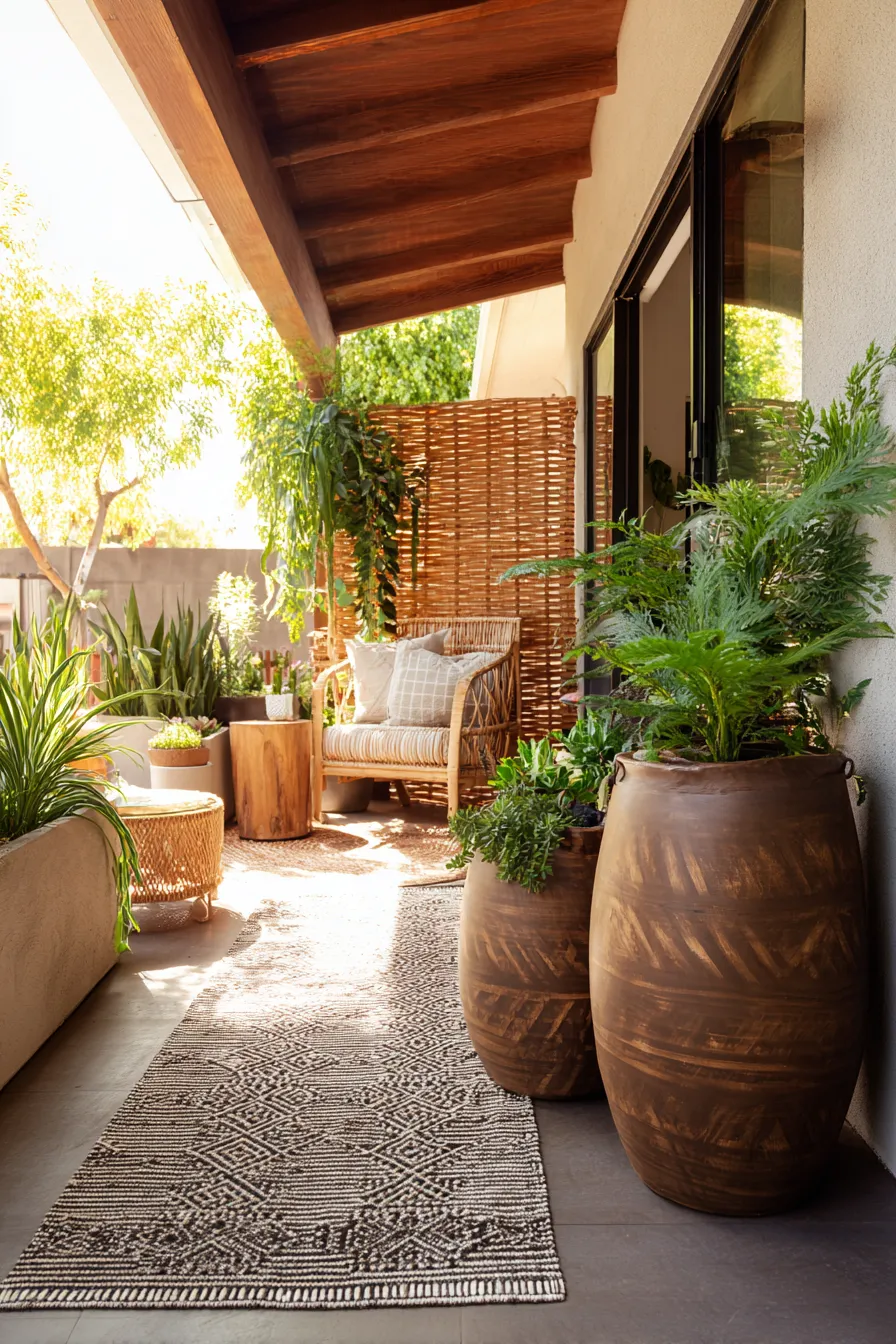 This porch layers large planters with a woven privacy screen to create a cozy seating nook. Natural textures like wood and woven fibers keep the space warm and inviting. The plants add softness and coverage without blocking light. The porch feels relaxed and welcoming.