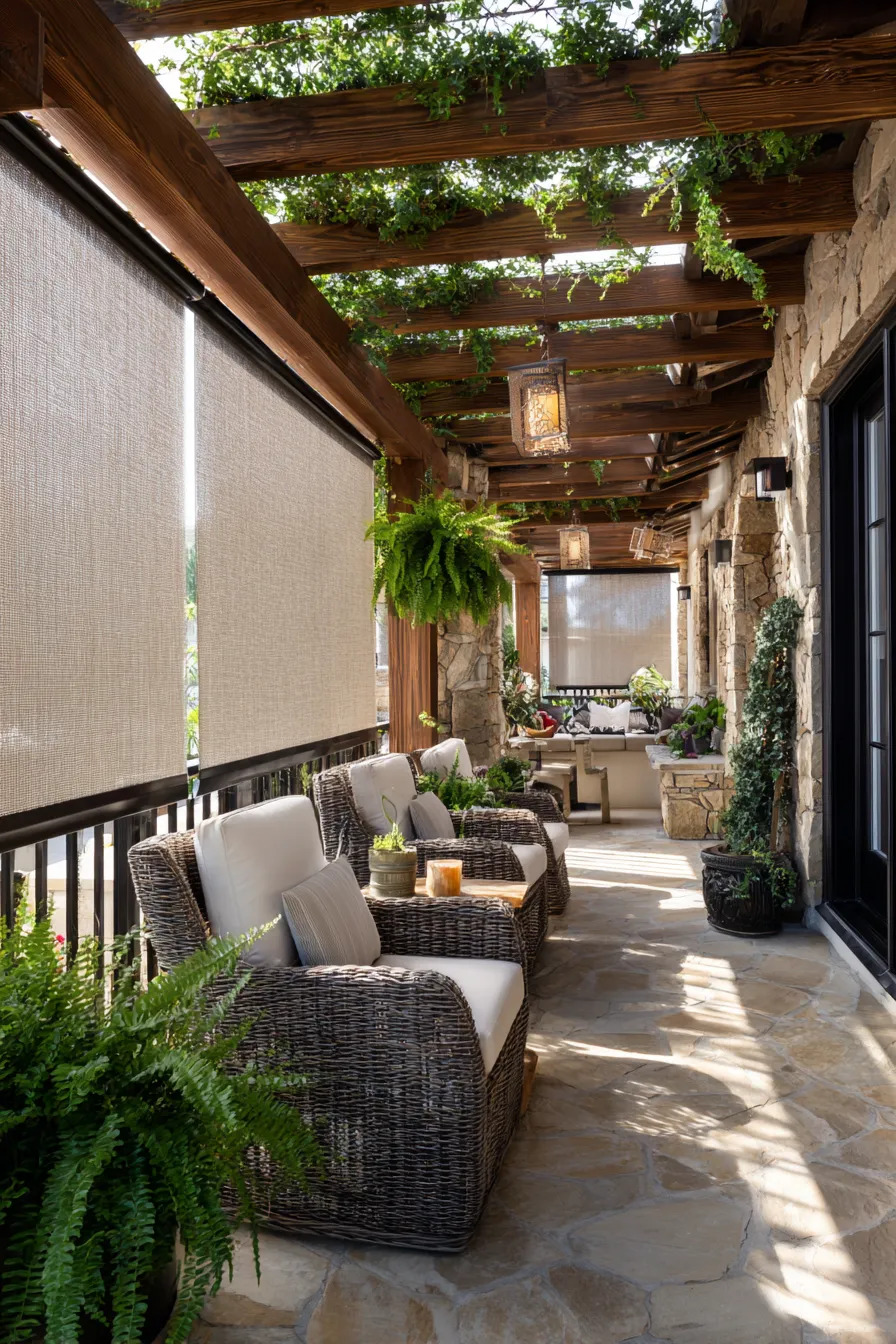 This porch features a wooden pergola layered with greenery overhead and roll down fabric screens along the sides. Wicker seating with soft cushions lines the wall, creating a relaxed and sheltered sitting area. Stone flooring and hanging lanterns add warmth while the screens gently block outside views. The space feels open yet comfortably protected.