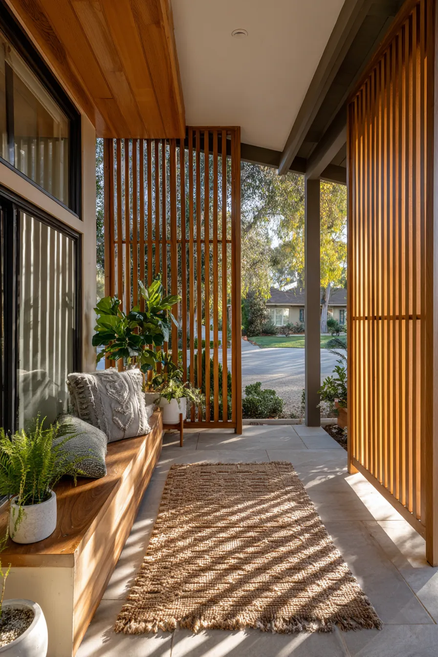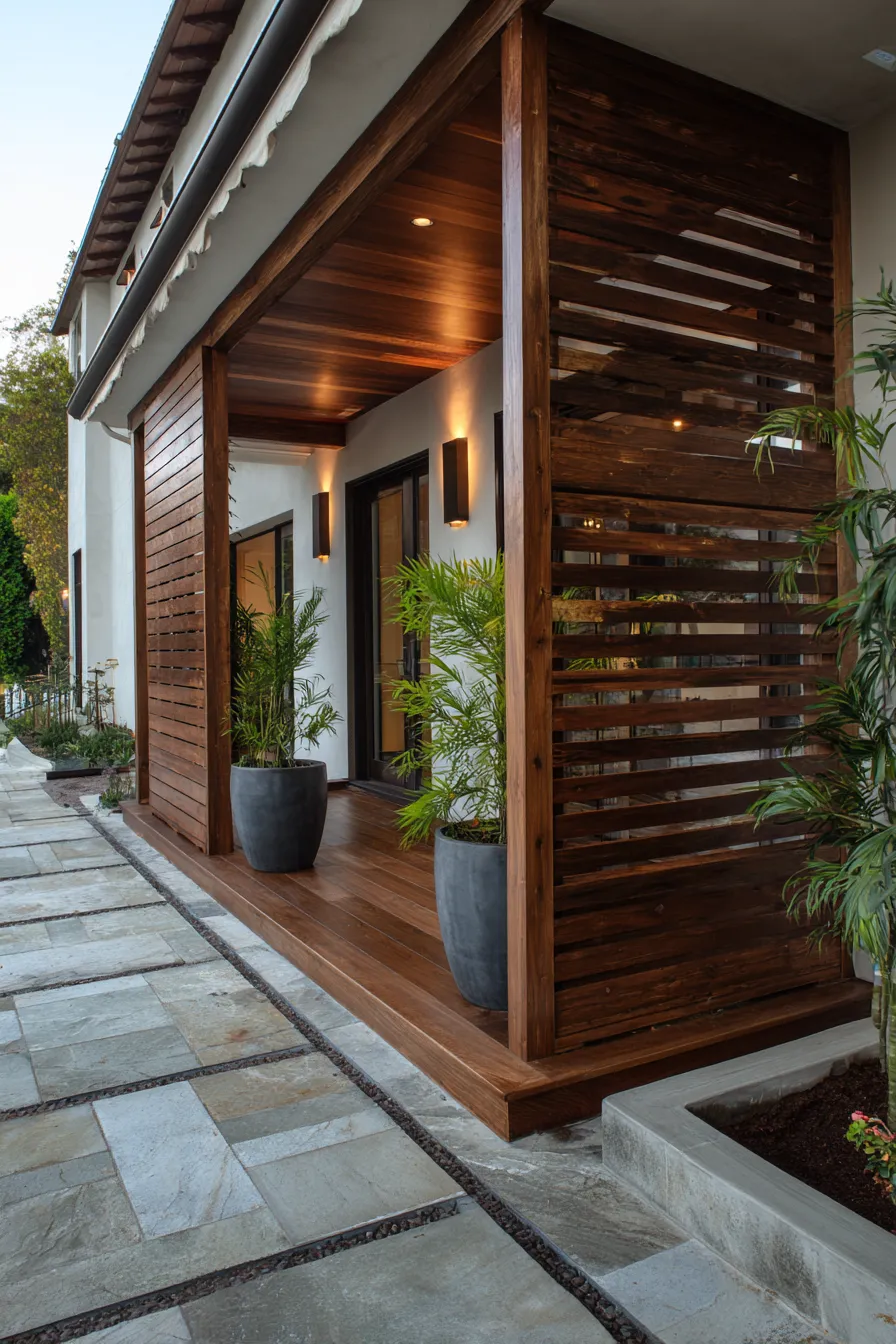 This porch features rich wood slat walls that block direct views while keeping the space airy. Soft lighting and simple seating create a cozy nook tucked beside the entry. Potted plants add texture and warmth. The design feels modern yet inviting.