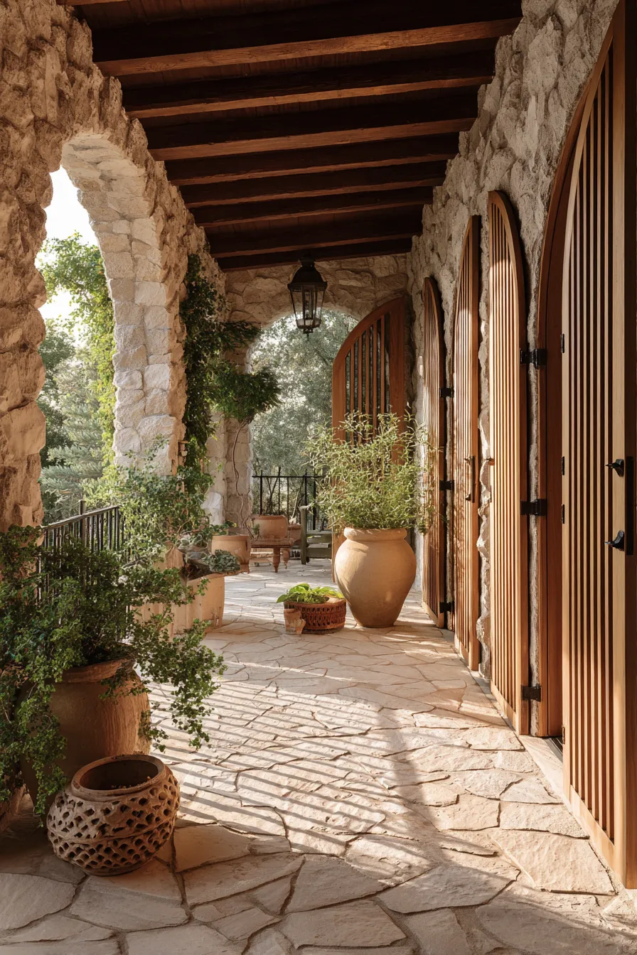 This porch is wrapped in textured stone with arched openings that naturally frame the space. Wooden shutters and thick walls create a sense of enclosure while still letting in light. Clay pots and greenery add softness to the stone surfaces. The overall feel is warm and quietly elegant.