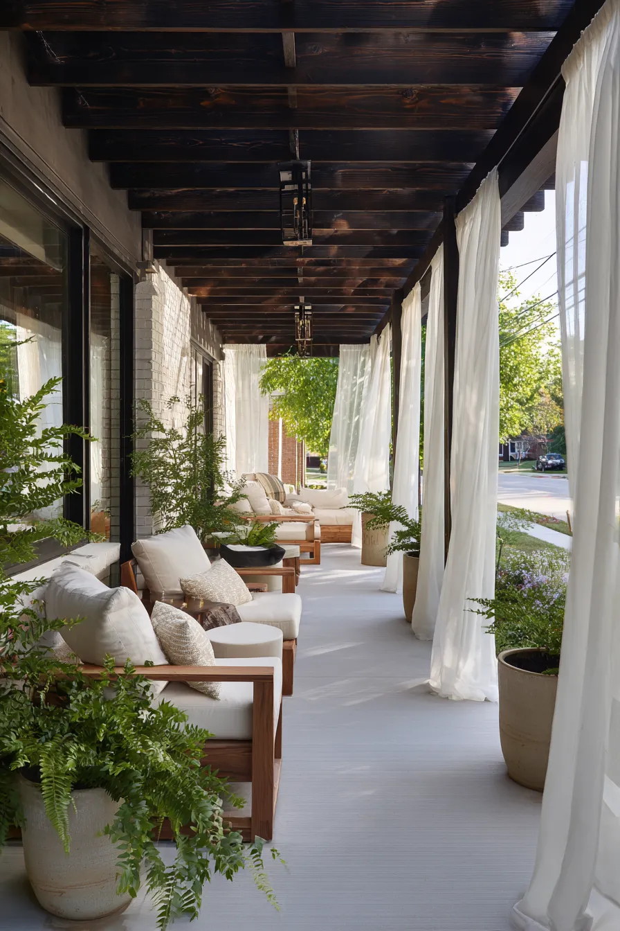 This long porch features flowing white curtains that gently frame the space and soften the view from outside. Wooden lounge chairs and neutral cushions create a calm and airy setup. Potted greenery fills the gaps and adds natural privacy along the edge. The overall look feels breezy and effortless.