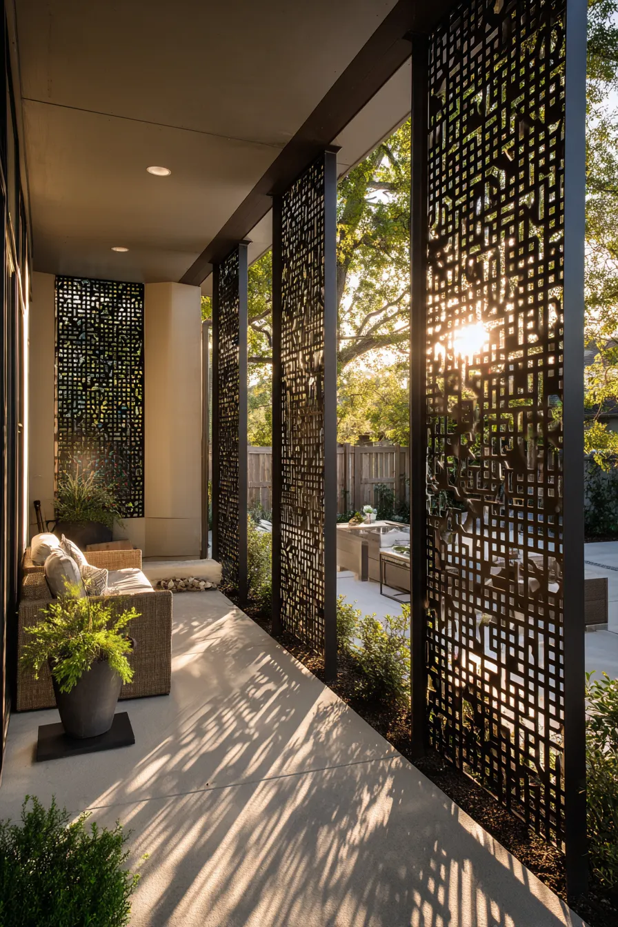 This porch uses patterned privacy panels to block direct views while allowing sunlight to cast beautiful shadows. Neutral furniture and soft cushions keep the look calm and balanced. Greenery tucked between the panels adds warmth and texture. The space feels stylish and thoughtfully layered.