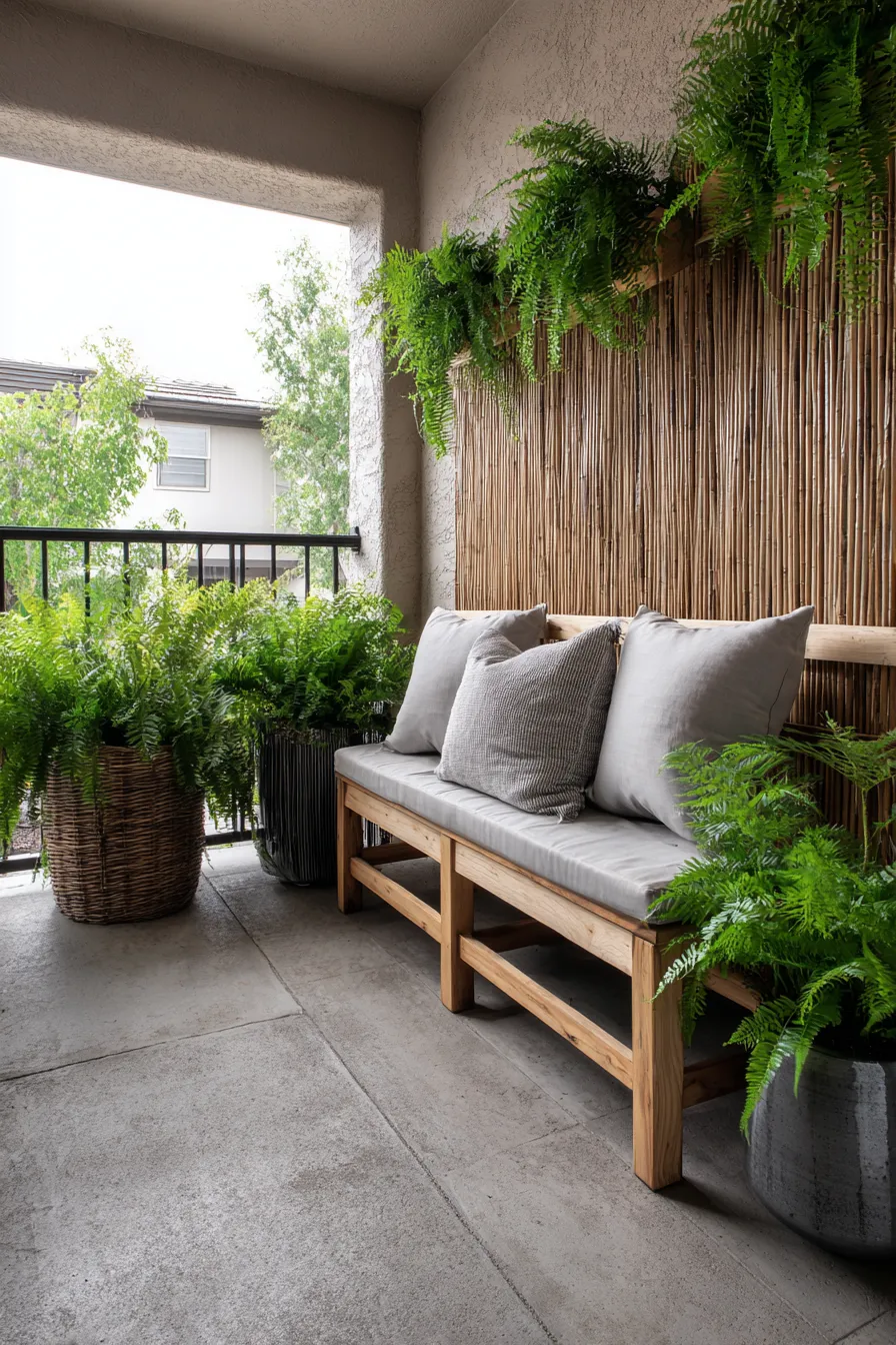This porch features a bamboo style privacy wall paired with overflowing ferns and leafy plants. A simple wooden bench with neutral cushions keeps the focus on the greenery. The natural materials create a cozy and grounded atmosphere. It feels tucked away from neighboring views.