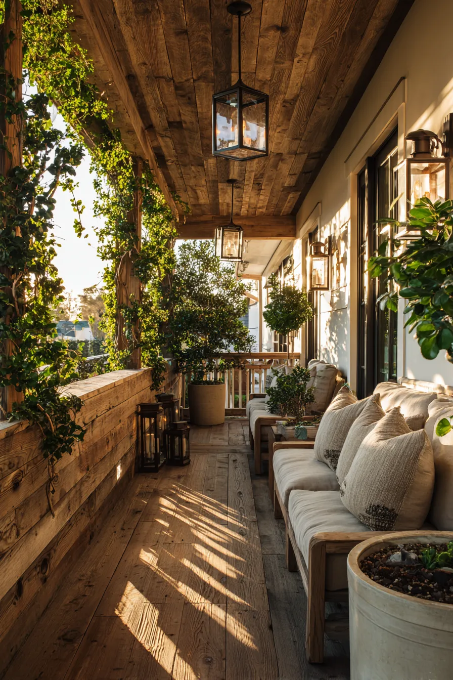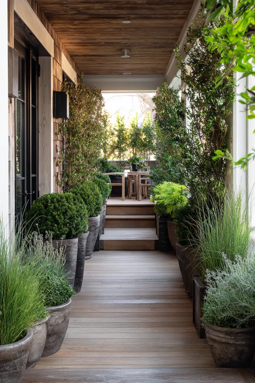 This porch uses tall planters and layered greenery to create a private pathway feel. The narrow layout feels intimate while still open to fresh air. Wood ceilings and soft light add warmth to the space. The plants gently block views without feeling heavy.