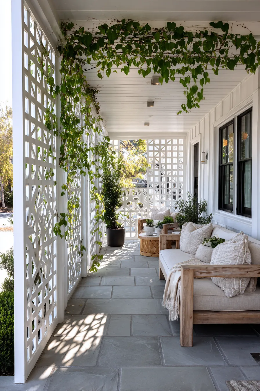 This porch uses a white trellis design paired with climbing plants to gently block outside views. Neutral furniture and soft textiles keep the space light and inviting. The patterned panels add interest without overwhelming the design. Everything feels calm and thoughtfully styled.