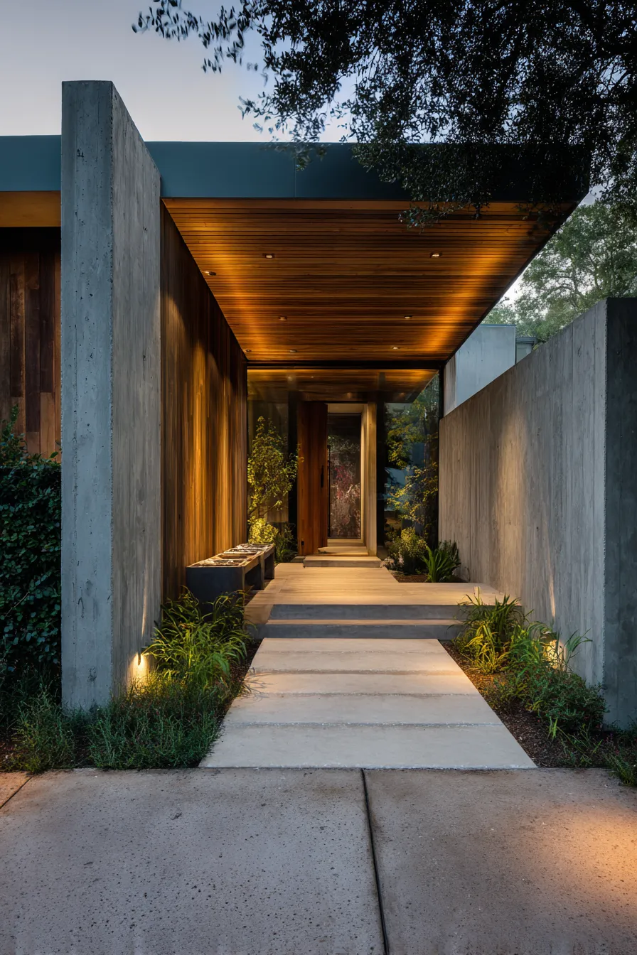 This front porch uses tall concrete walls to create a tucked away entry that feels calm and protected. Warm wood ceilings and soft lighting guide the path inward without exposing the space to the street. Low greenery lines the walkway to soften the modern structure. The overall look feels intentional and quietly luxurious.