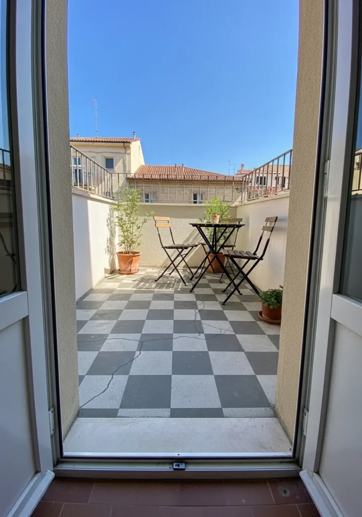 This small terrace features a bold black and white checkerboard floor created with simple paint over existing tiles. The space is compact with slim metal railing and a tiny bistro table tucked into the corner. The clean geometric pattern instantly draws the eye and makes the narrow layout feel styled and intentional. The design feels fresh, modern, and budget conscious without looking overdone.