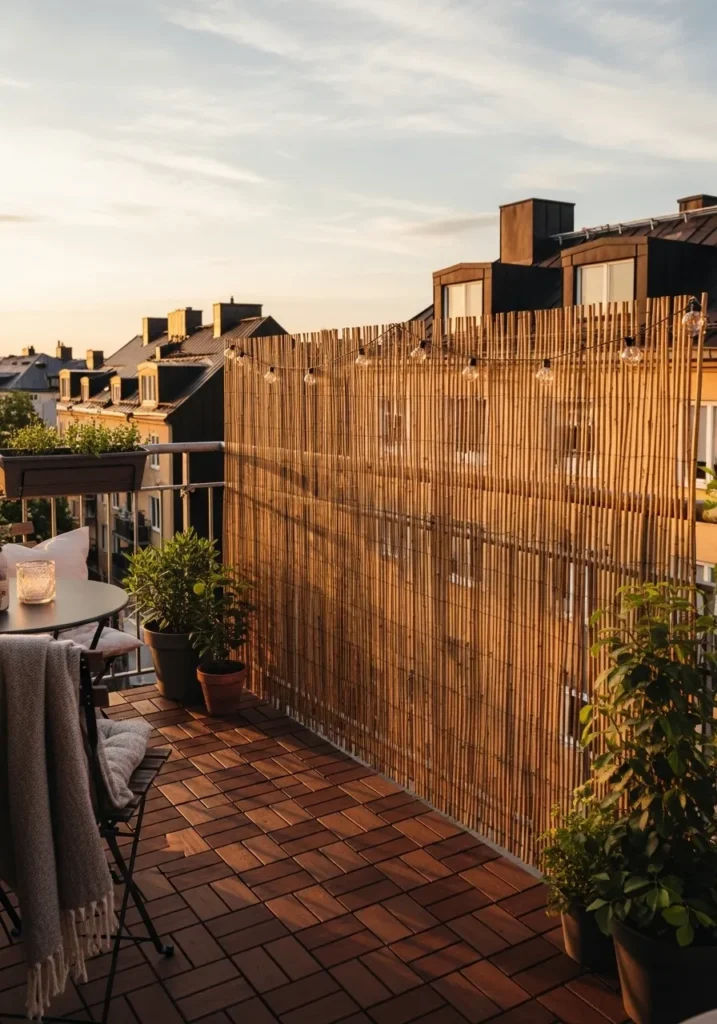 Tall bamboo fencing panels line the terrace railing, creating a cozy and private atmosphere. The natural wood tones soften the urban surroundings and add warmth to the outdoor space. The screen transforms the terrace from exposed to intimate in a simple and affordable way.