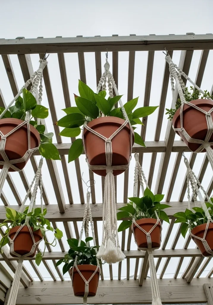 Multiple terracotta pots hang from a pergola structure using macrame plant holders. The greenery cascades downward, adding vertical interest and movement. The wooden beams above create a warm frame around the plants and give the terrace a cozy garden feel.