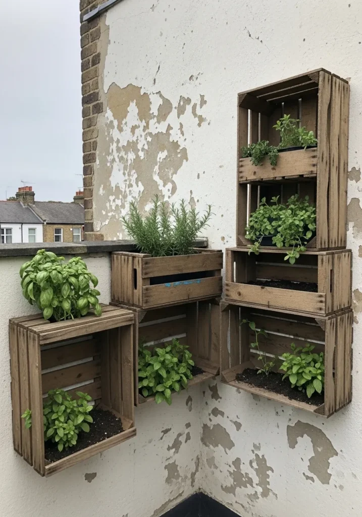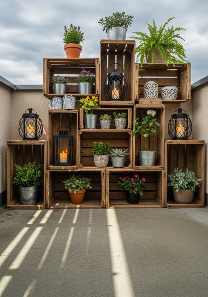 This terrace wall is styled with stacked wooden crates arranged into a full shelving feature. Each crate holds potted plants, small herbs, and metal lanterns with soft candlelight glowing inside. The raw wood texture contrasts beautifully with the greenery, and the layout turns a plain wall into a layered focal point. The display feels handcrafted and thoughtfully arranged without looking overly styled.