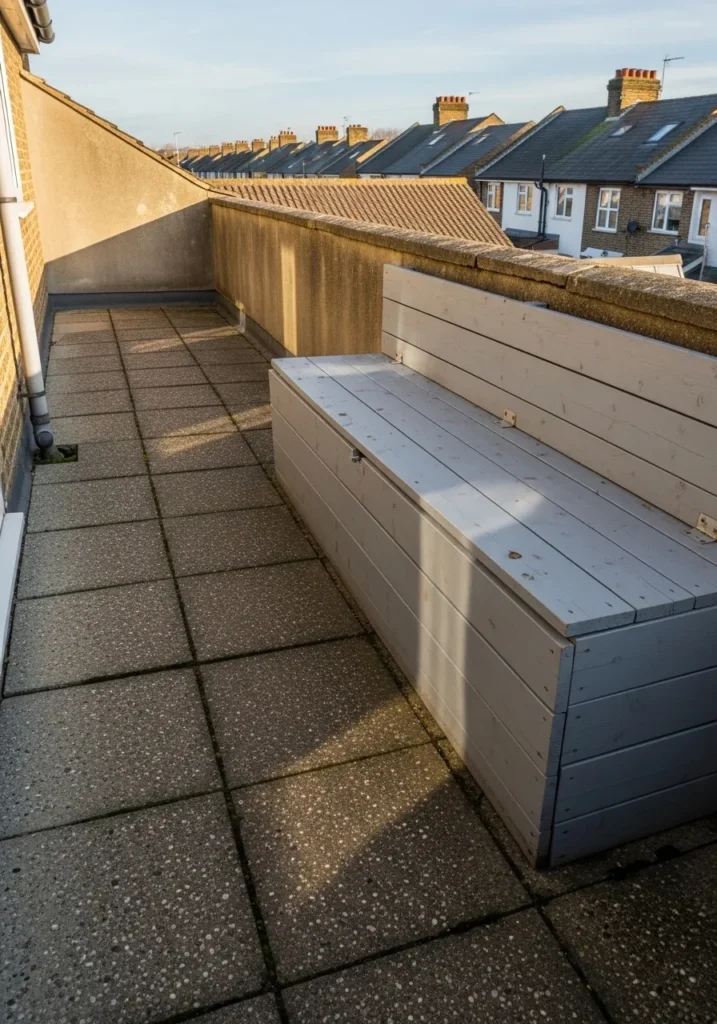 A long built in bench stretches along the terrace wall, painted in a soft neutral tone with hidden storage underneath the seat. The simple rectangular design keeps the look modern and uncluttered, while the length maximizes seating in a narrow space. It blends seamlessly into the terrace layout and feels custom made for the area.