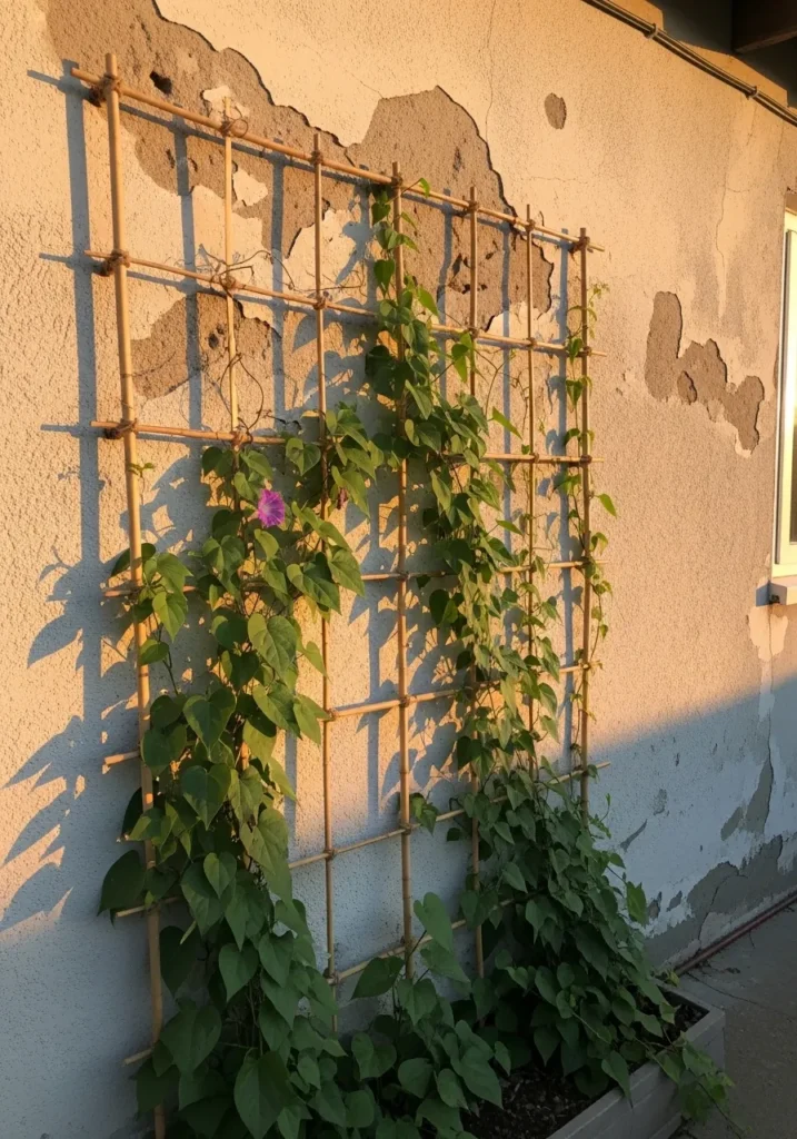 A wooden trellis panel is mounted against a lightly weathered wall, allowing climbing vines to weave their way upward. The grid pattern gives structure while the greenery softens the hard surface behind it. Sunlight hits the leaves, casting gentle shadows that make the wall feel alive.