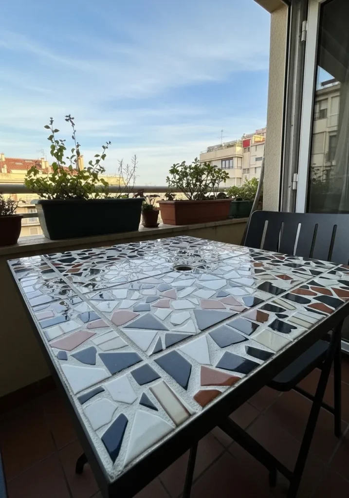 A small outdoor table has been upgraded with a mosaic of mismatched tiles in soft neutral tones. The irregular shapes and subtle color variations create texture and personality across the surface. Set against a bright terrace backdrop, the table becomes the star of the space.