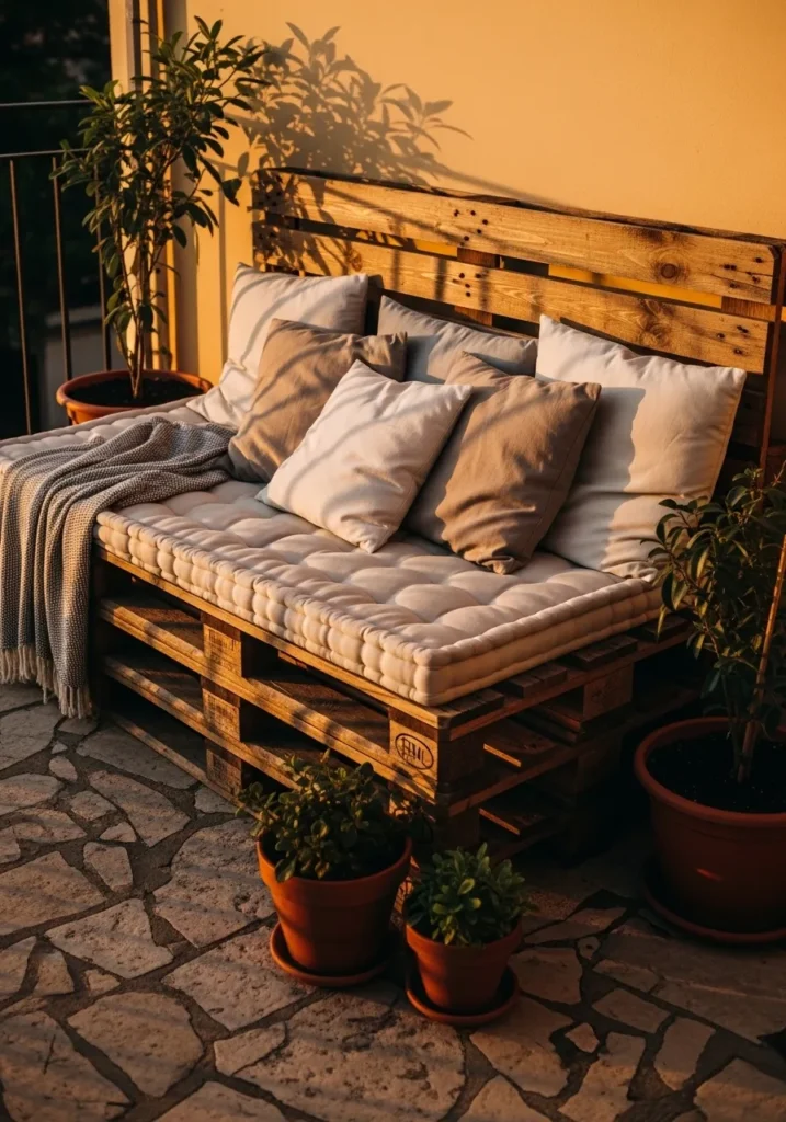 Stacked wooden pallets form the base of this cozy terrace sofa, topped with thick cushions in soft beige and warm gray tones. A few layered pillows and a casual throw make it feel inviting and relaxed. The low profile design works perfectly in a compact terrace setting.