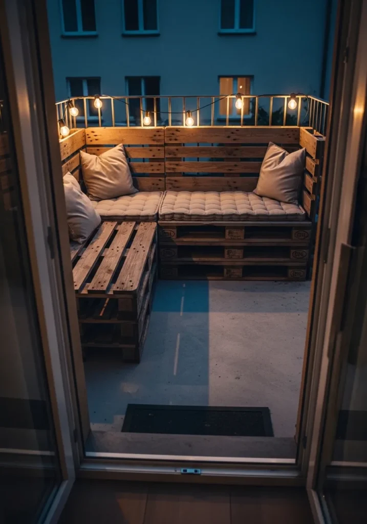 This cozy terrace setup uses stacked wooden pallets to create an L shaped corner sofa topped with thick neutral cushions. Soft string lights are attached along the railing, creating a warm glow against the dark evening sky. The seating fills the corner perfectly, maximizing every inch of space while keeping the materials simple and affordable.