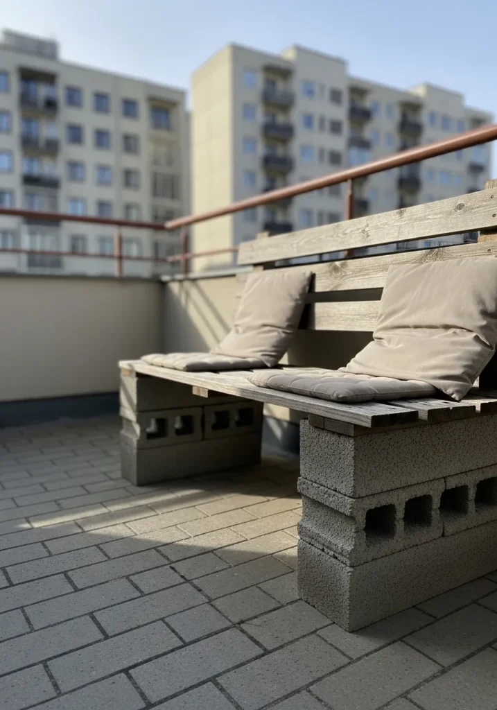 This terrace features a low profile sofa built from stacked concrete cinder blocks topped with thick wooden planks. Soft beige and taupe cushions line the seating, creating a cozy contrast against the industrial base. The clean layout keeps the focus on the smart construction, while the open terrace railing and city buildings in the background make it feel urban and practical. The size is generous enough for lounging but compact enough for a smaller balcony setup.